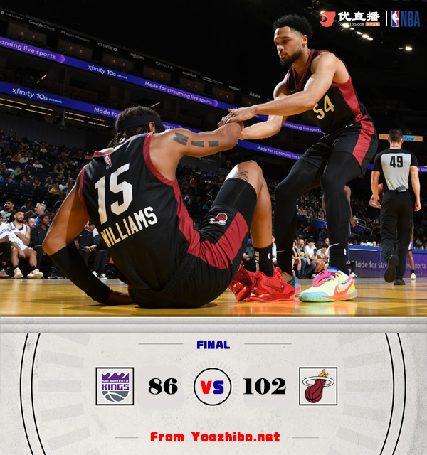 24直播网讯 7月8日讯 NBA夏季联赛加州经典赛,热火对阵国王。一开场,热火率先发力打出7-1的开局,国王不断冲击篮筐频频得手很快完成反超,此后双方陷入缠斗,比分交替领先,热火持续发力打出12-3的攻击波占据主动,国王连投带罚努力追赶,斯尼德造成三分犯规三罚全中后分差仅剩3分,但斯威德内外开花连得10分帮助热火56-44领先国王结束上半场。下半场,两队围绕10分分差展开拉锯战,热火不断强攻内线拿分,国王连中三分咬住,末节国王奋力反击缩小分差,热火稳扎稳打保持优势。最终,热火102-86力克国王,取得胜利。