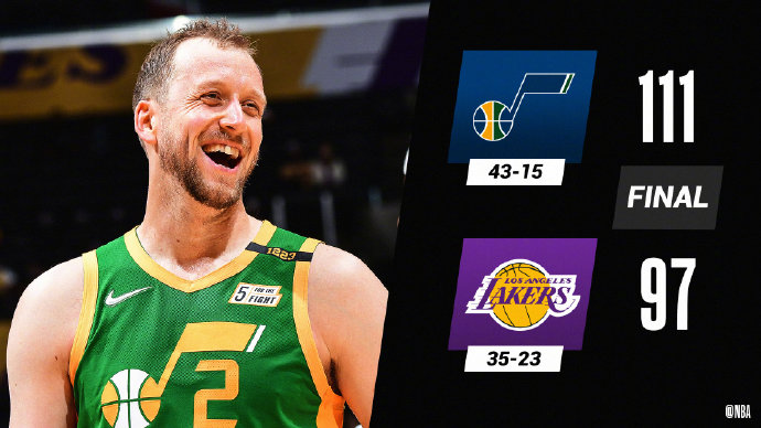 爵士(43-15):克拉克森22分3篮板,康利14分10助攻,英格尔斯21分4篮板5助攻,奥尼尔13分9篮板5助攻,波格达诺维奇19分3篮板4助攻,戈贝尔14分10篮板2封盖。