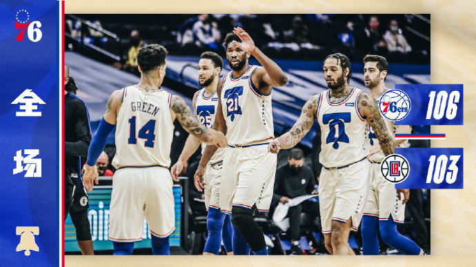 24直播网4月17日讯 今日NBA常规赛,快船客场挑战76人,本场比赛乔治复出,莱昂纳德继续缺战。比赛开始,76人迅速找到进攻节奏,三分线外神准,一波15-0进攻高潮取得大比分领先,快船慢慢找到进攻感觉,但首节结束仍然落后76人11分。次节开始后,快船进攻效率依然不高,虽然一度将分差缩小至5分,但很快就被76人再次拉开差距,半场战罢,76人59-47依然保持12分领先。下半场开始后快船外线开始发力,连续命中3记三分将分差缩小至只剩3分,乔治延续上半场火热状态里突外投接连拿分,恩比德依靠内线优势替76人稳住局面,三节结束,76人只领先快船4分。最后一节,快船持续发力依靠外线火热手感将比分反超,76人依靠恩比德内线优势不断造成杀伤,雷吉最后时刻关键三分将分差缩小至1分,格林依靠罚球取分稳住局面,最终76人力克快船终结其7连胜。