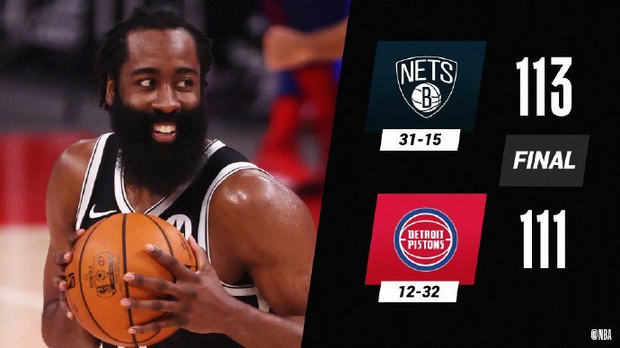 24直播网3月27日讯 今日NBA常规赛,篮网客场挑战活塞。篮网目前30胜15负排名东部第3,活塞则12胜31负排名东部垫底。比赛开始,活塞率先发力取得5分领先,篮网逐渐找到进攻状态将比分反超,首节结束,篮网领先活塞7分。次节开始,斯图尔特肘击格里芬遭驱逐,哈登连续得分将分差逐步扩大,半场战罢,篮网59-50领先9分。易边再战,活塞外线手感恢复,抓住篮网失误一度将比分反超,但哈登最后时刻发力连得5分,篮网82-78领先4分结束第三节。末节初段,篮网下起三分雨,将比分优势迅速扩大至12分,活塞外线逐渐找到手感,一度将比分扳平,关键时刻,杰夫-格林命中关键三分,哈登6犯离场,随着活塞最后一攻不中,最终篮网113-111险胜活塞。