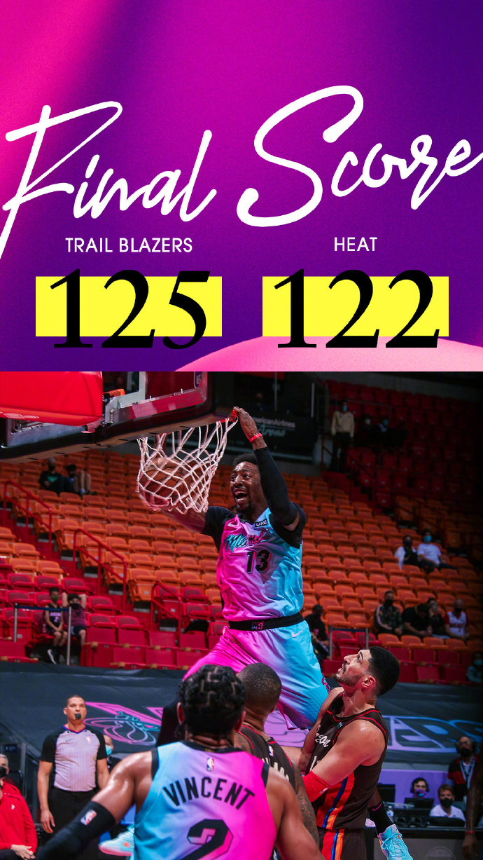 24直播网3月26日讯 NBA常规赛,热火主场迎战开拓者,热火最近已经4连败掉落至东部第5位,开拓者也是2连败排在西部第6位,但交易截止日刚刚过去,因涉及到伤病、交易等,热火巴特勒等多名球员本场缺战。开局上来开拓者打出10-2开局建立优势,麦科勒姆也是手感火热连续砍分,开拓者在麦科勒姆单节21分的带领下首节结束领先7分,次节热火三分手感不错将分差反超,随后双方展开拉锯战,半场结束热火只落后1分。下半场双方还是非常胶着的拉锯战,你进一个我还一个,麦科勒姆状态依然不错,热火众将也能回应上,三节结束双方打平,末节热火突然找到外线手感连续扔进5记三分一举建立优势,但利拉德带领打出一波11-0又将比分反超回来,最后时刻双方连续打成,比分交替领先,利拉德三分造犯规罚球绝杀,开拓者险胜热火,送给对手5连败。