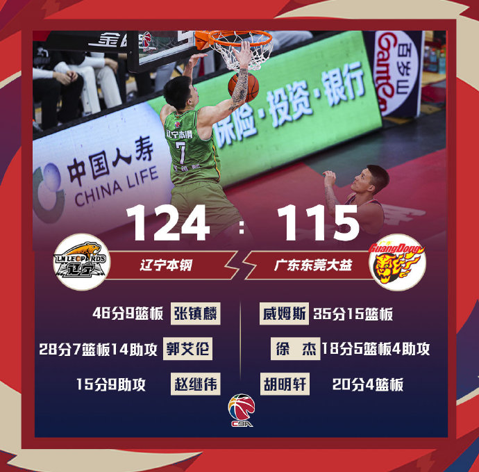 辽宁(34-7):张镇麟46分9篮板3断2助攻、郭艾伦28分7篮板14助攻4断,韩德君14分9篮板2帽,赵继伟15分9助攻5断3篮板,朱荣振8分6篮板2帽,付豪6分5篮板,刘志轩2分3篮板2助攻,梅奥5分2助攻2断。