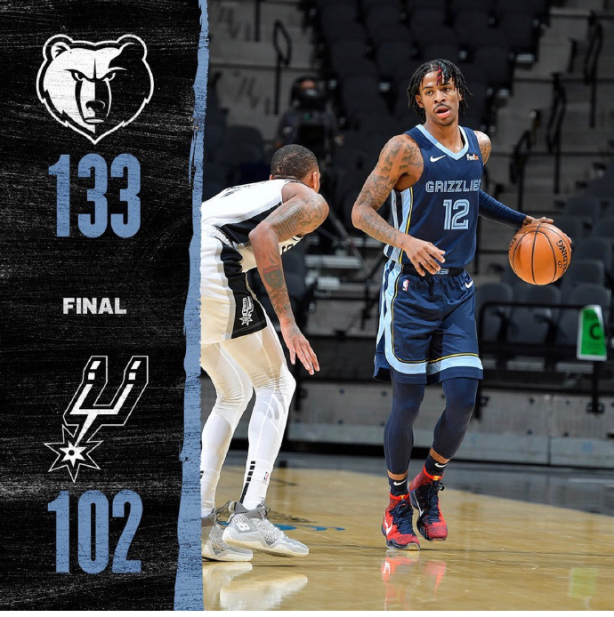 灰熊(9-6):吉昂19分9篮板、克拉克18分6篮板2盖帽、安德森17分9篮板3助攻、蒂尔曼10分10篮板2抢断3盖帽、布鲁克斯13分、莫兰特13分3篮板8助攻2抢断、泰厄斯-琼斯11分13助攻2抢断、梅尔顿17分6篮板5助攻、贝恩10分3篮板、康查尔5分5篮板。
