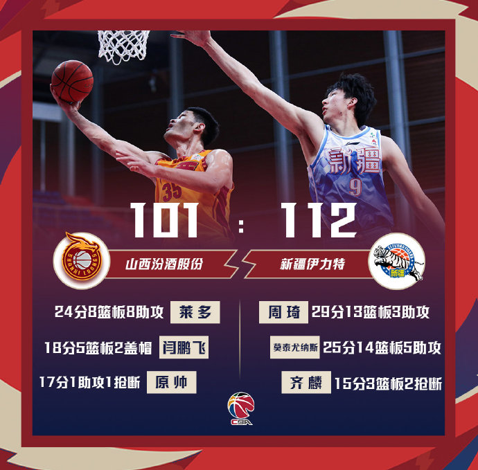 新疆:周琦29分13篮板3助攻,莫泰尤纳斯25分14篮板5助攻3抢断,曾令旭9分14助攻3抢断,齐麟15分3篮板,阿不都沙拉木11分5篮板5助攻,唐才育8分,于德豪11分3抢断,吴永盛2分2抢断,梁英淇2分