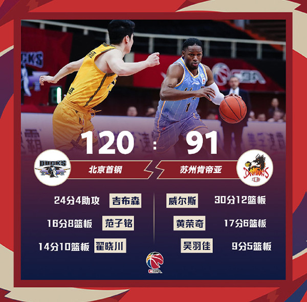 24直播网1月16日讯 CBA常规赛今日继续进行,北京对阵江苏,首节比赛北京就展现出了强大的进攻火力,凭借在内线的优势保持大比分领先,首节结束北京38-22领先江苏,次节再战,北京继续依靠自己的内线优势扩大领先,随后外线火力全开,分差来到30分以上,本节后半段北京保持优势,江苏只能凭借外援威尔斯的零敲碎打得到分数,半场结束,北京78-44领先江苏。易边再战,北京外线失准,江苏趁机打出一波11-0缩小差距,此时汉密尔顿站出来稳住局势,两队分差在三十分上下浮动,来到本节末段北京外线再度开火扩大优势,三节结束,北京102-65领先江苏。最终决战,面对北京内线优势,江苏无计可施,随着本节中段王晓辉又一记三分入网,分差来到40分,随着时间推移,比赛早早失去悬念,最终全场比赛比赛结束,北京120-91大胜江苏止连败。