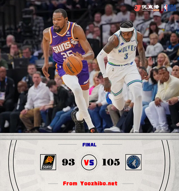 24直播网4月24日讯 NBA季后赛首轮G2,森林狼主场迎战太阳,首场比赛森林狼拿到大胜,1-0领先。比赛开始,太阳很是慢热,3分钟内没得分,森林狼打出8-0不错开局,阿伦三分终于开局,森林狼接连打内线继续拉大分差,杜兰特手感不佳,布克造杀伤能追分,唐斯首节就领到3次犯规,首节太阳落后3分,次节森林狼进攻端受阻,比尔里突外投连砍7分,太阳顺势一波小高潮反超比分,康利里突外投单节上双止血,半场太阳仅领先1分。下半场,阿伦受伤上场,唐斯里突外投连砍6分,麦克丹尼尔斯内线也能连续取分,森林狼一波小高潮重新建立7分领先,末节太阳又是突然崩盘,康利三分命中后麦克丹尼尔斯接连上篮命中,森林狼11-0领先到17分,太阳喊掉最后一次暂停,森林狼牢牢掌握住双位数领先,最终森林狼105-93再胜太阳,2-0领先。