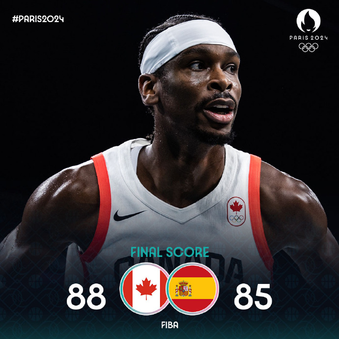 24直播网8月3日讯 奥运男篮小组赛A组,加拿大对阵西班牙。比赛开始,加拿大率先发力开局10-4领先,西班牙内外开花回敬13-4的攻击波迅速反超,但次节西班牙命中率下降,加拿大连投带罚一举将分差拉开到两位数,半场战罢加拿大49-38领先西班牙。易边再战,两队围绕10分分差展开激烈争夺,西班牙连中三分缩小分差,加拿大冲击篮筐稳住局势,末节西班牙一度将分差迫近到只剩3分,狄龙得分助攻一肩挑稳住局势,西班牙多点开花顽强咬住,双方争夺陷入白热化,关键时刻巴雷特命中三分将分差拉开到5分,亚历山大两罚中一后鲁尔三分续命。亚历山大两罚全中,最终,加拿大力克西班牙。