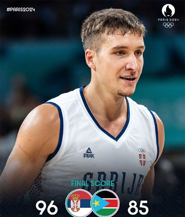 24直播网讯 北京时间8月4日讯 奥运男篮小组赛C组,塞尔维亚男篮对阵南苏丹男篮。前两场小组赛,两支球队皆是一胜一负。比赛开始,双方上来通过三分开局,塞尔维亚接连突破取分建立主动权,但南苏丹接连三分回应一波8-0,比分持续胶着,米西奇突破打板助塞尔维亚首节领先1分,次节博格丹和约维奇接连三分,塞尔维亚一波11-3进攻波领先到近10分,但南苏丹依然内外开花顽强咬住比分,约基奇接连内线强打半场助队领先3分。下半场,约基奇与博格丹一内一外继续扛起球队进攻,沙约克连续三分再次回应,随后约基奇接连内线取分带领球队一波7-0再次建立领先,末节加布里埃尔继续追分,但博格丹接连中远投还是能给出回应,随后塞尔维亚一波进攻波领先到17分,南苏丹连续追进3记三分但时间所剩无几,最终塞尔维亚力克南苏丹,以小组第二晋级8强;南苏丹由于净胜分劣势被淘汰。