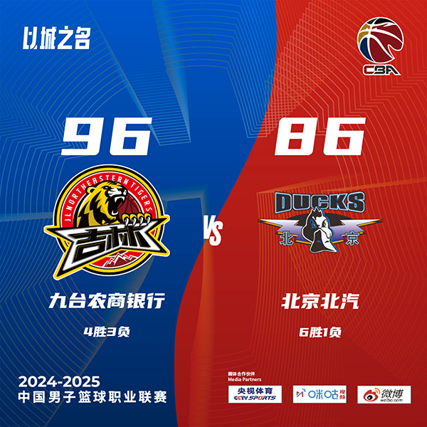 24直播网10月27日讯 CBA常规赛,北京对阵吉林。北京开赛已取得6连胜,周琦继续缺阵。上半场,陈盈骏开场因伤下场,两队短暂相持,北京持续发力取得9分领先,吉林连投带罚迅速追赶,次节双方继续缠斗,得分非常困难,北京全民皆兵,吉林凭借两位外援给出回应,半场战罢北京39-35领先吉林。下半场,琼斯突然发力,单节独得15分帮助吉林确立优势,末节吉林持续发力一度将分差拉开到17分,北京苦苦追赶无果。最终,吉林96-86力克北京,终结对手开赛6连胜。