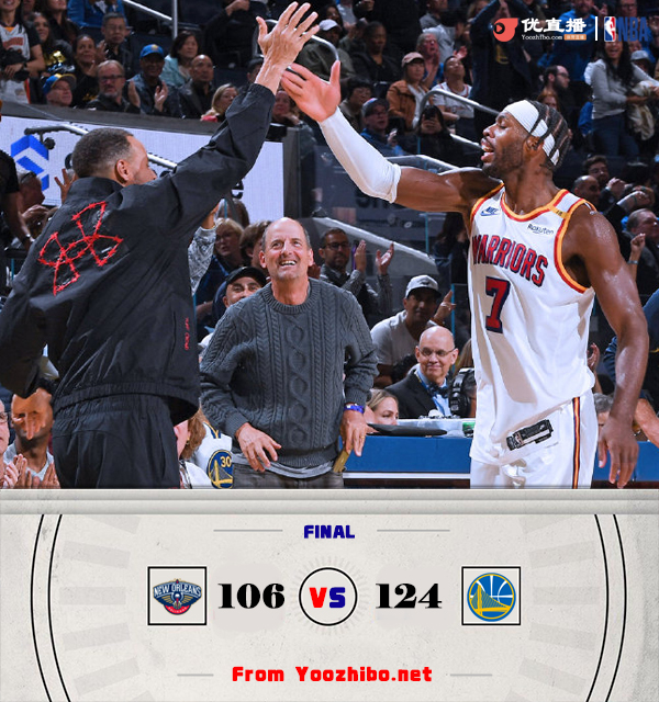 24直播网10月30日讯 NBA常规赛继续进行,勇士坐镇主场迎战鹈鹕。库里上一场受伤离场并缺席本场比赛,同事维金斯和梅尔顿也缺阵。首节之争缺少核心的勇士完全不在状态单节仅得到14分,鹈鹕在双核锡安、英格拉姆带领下连续打出反击首节就拿到17分领先;次节场面迎来反转,首节茫然无措的他们在这一节突然暴走回敬30-14的攻势一举追上并带着4分劣势进入下半场。休息归来双方短暂对攻但勇士的攻势更加持久,节中他们抓住对手熄火的机会送出22-8的攻势实现反超,随后越战越勇的他们在第四节初再送7-2的攻势拉开两位数分差,这之后勇士寸土不让一直牢守两位数领先保持到最后。最终,勇士击败鹈鹕避免连败。