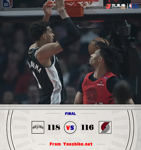 24直播网讯北京时间12月14日讯 NBA常规赛,开拓者主场迎战马刺,开拓者4连败后8胜16负排在西部第13位,马刺则是12胜12负排名西部第11,本场比赛艾顿和罗威都缺阵。比赛开始,开拓者上来打出12-5开局,随后开拓者突然断电,文班亚马攻防建功带队轰出17-3攻击波一举反超比分,保罗接连抱怨裁判连吃2T被驱逐,首节马刺领先8分,次节双方命中率都有下降,场上连续打铁,打了半节多都未得分上双,文班上场再次连续得分带队半场领先10分。下半场,格兰特连续3记三分一度助开拓者抹平分差,随后格兰特继续发力再扔进3记三分,单节轰下22分带队轰出46分直接反超8分,末节马刺连续失误,西蒙斯连续扔进三分带领开拓者一度领先到17分,但尚帕尼接连三分,马刺全民皆兵强势回应24-4进攻波反超比分,比赛进入白热化,文班亚马被格兰特犯规两罚领先,阿夫迪亚绝杀三分不中,最终马刺118-116险胜开拓者,送对手5连败。