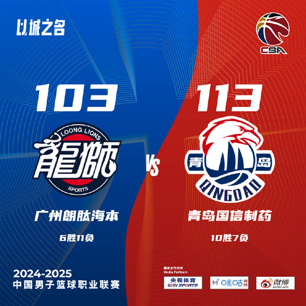 24直播网讯 2024年12月14日讯 CBA常规赛,广州主场迎战青岛,广州目前6胜10负排在第15位,青岛则是9胜7负排名第10,本场比赛郭艾伦继续缺阵,丁彦雨航还未体测。比赛开始,杨瀚森攻防两端发力,赵嘉义也接连三分命中,青岛顺势取得领先,但广州双外援联手回应咬住比分,韦瑟斯庞里突外投连砍9分,首节青岛领先5分,次节米奇和韦瑟斯庞协同发力拉开双位数领先,随后青岛下起三分雨一度领先到近20分,但广州半场结束前接连3记三分回应追到差9分。下半场,双方展开拉锯战,广州依靠外援追分,韦瑟斯庞连续3记不讲理超远三分强势回应,三节青岛继续领先10分,末节双方还是外援互相对飚,分差始终保持在10分左右,韦瑟斯庞总能在关键时刻站出来回应,最终青岛113-103力克广州。