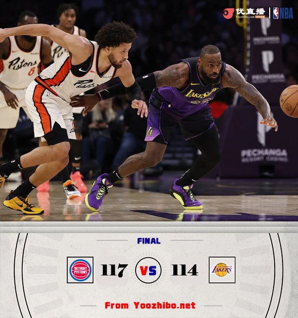24直播网讯北京时间12月24日讯NBA常规赛继续开打,湖人坐镇主场迎战活塞,湖人近期状态回暖,过去两场双杀国王后取得3连胜;活塞方面上一场击败太阳后,近期3胜2负状态同样有所回暖。首节之争双方状态都非常出色一路对攻,湖人开局稍占上风但末段让出主动权,活塞最后4分钟里命中4记三分送出16-6的攻势一举反超比分;次节剧本反转,这一次轮到活塞占据主动领先大半节时间,但最后时刻湖人连续回敬三分并夺回2分领先进入下半场。休息归来场面依旧持续拉锯,两支球队没有绝对爆点高分但命中率奇高,三节结束时双方都保持着超50%的命中率,不过末节决胜还是活塞笑到最后,湖人节中熄火直接导致败局,活塞则依靠一波7-0拉开两位数领先,詹姆斯末段连拿5分帮助球队在读秒阶段追至3分,不过最后错失扳平三分未能扳平比分。最终,活塞客场掀翻湖人拿下比赛。