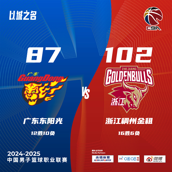 24直播网讯北京时间12月25日中国男子篮球职业联赛 常规赛,广东东阳光对阵浙江稠州金租。半场广东50-52浙江,最终广东87-102浙江。广东东阳光徐杰21分3板9助,埃里克-莫兰德19分12板5助,新援莱斯登场4分钟1篮板1抢断;浙江稠州金租科比-西蒙斯24分4板5助,余嘉豪17分12板4助。