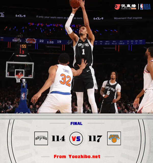 24直播网12月26日讯 NBA圣诞大战,马刺客场挑战尼克斯。马刺15胜14负西部第九,尼克斯19胜10负高居东部第三。比赛开始,双方开场势均力敌,比分交替领先,唐斯不断冲击篮筐,文班亚马连中三分给出回应,次节马刺持续发力,文班亚马内外开花连续拿分,布里奇斯稳定输出带队咬住,马刺打出11-2以58-51领先结束上半场。易边再战,尼克斯占得先机,布里奇斯和唐斯联手拿分带队迅速反超,末节马刺轰出16-6夺回领先,尼克斯外线开火连中三分强势回应,关键时刻布里奇斯延续火力带队确立优势,保罗三分续命,哈特连续抢到前场篮板耗尽时间杀死比赛。最终,尼克斯117-114力克马刺。