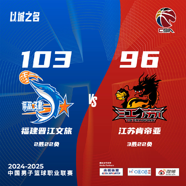 24直播网讯 北京时间12月31日讯 CBA第二阶段赛事继续开打,福建和江苏迎来一场对决,这也是倒数第一和倒数第二之间的对决,目前联盟副班长福建正遭遇15连败。首节之争福建状态依旧糟糕,面对联盟场均得分最低的江苏却丢了36分,开局被江苏打了一波11-2后就一直被动追分;不过江苏这个赛季一直进攻不稳定的老毛病在第二节出现,他们7分钟里仅得8分把自己带崩,福建笑纳大礼送出23-8的攻势直接弯道超车,不过福建的问题也是进攻端不稳定最后4分钟里仅得3分,江苏回暖回敬13-3的攻势夺回3分优势进入下半场。休息归来双方前期状态都不好一路打铁,不过福建从这波低迷中率先反弹,他们打出跨节21-6的攻势一举拉开两位数分差奠定胜局。最终,福建击败江苏结束15连败。