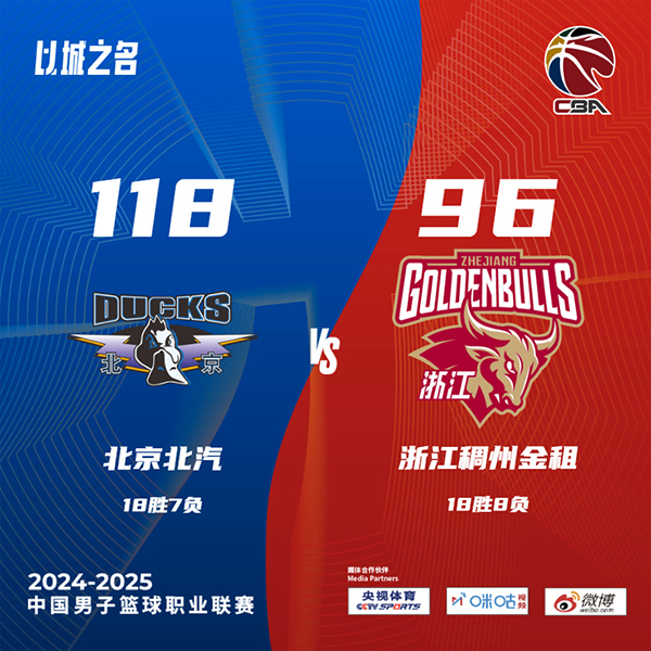 24直播网讯北京时间1月3日CBA常规赛,北京北汽对阵浙江稠州金租。本场比赛,稠州余家豪、吴前、程帅澎等球员均因伤缺阵。半场北京65-50浙江,最终北京118-96浙江。北京北汽尤金-杰曼24分6板13助,周琦18分4板,曾凡博16分6板;浙江稠州金租陆文博21分5板,约克22分3助。