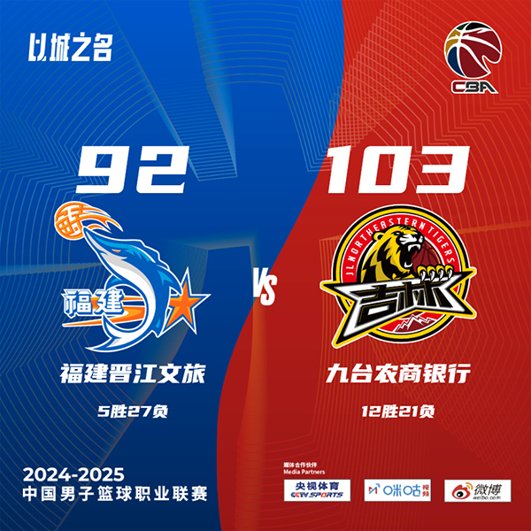 24直播网讯 北京时间1月20日讯 CBA常规赛继续进行,福建主场迎战吉林,吉林近期遭遇连败,目前11胜21负暂列联赛第15位,福建上场不敌广东,5胜26负联赛垫底。此役一上来双方便陷入缠斗,约瑟夫-杨和邹阳联手取分,琼斯盘活全队强势回应,两队你来我往比分紧咬,首节结束时福建领先2分,次节回来,双方继续鏖战,路易斯-金突然发力单节贡献12分,琼斯和基兹林克接连回应,半场战罢,福建依然领先2分。短暂休整后福建一波8-0一度拉开比分,吉林及时回暖连中三分,三节结束后吉林反超1分,末节决战,福建进攻滞涩,琼斯予取予求率队奠定胜势,福建追分无望,最终吉林103-92力克对手。