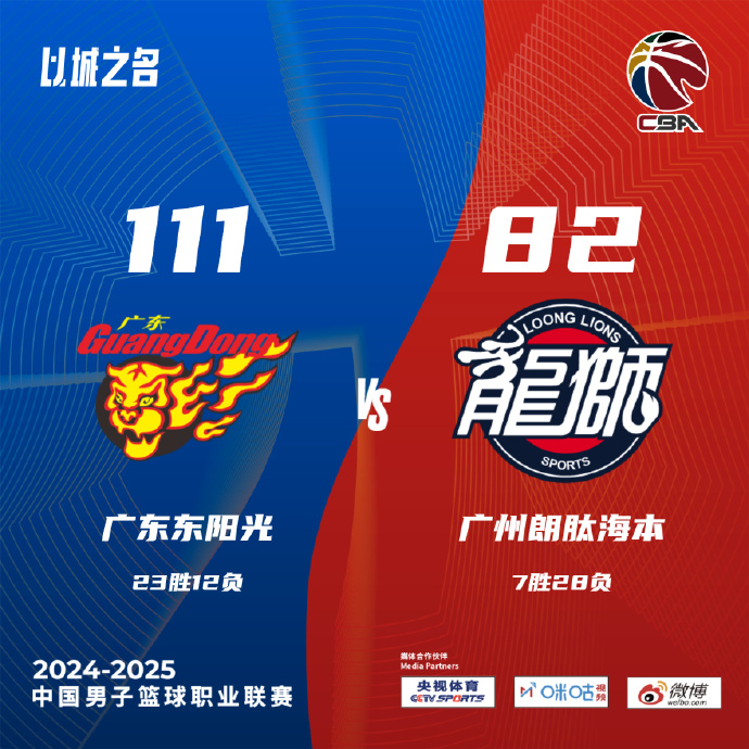 24直播网1月24日讯 CBA常规赛继续进行,广东主场迎来与广州的同省德比,郭艾伦此役缺阵,广州目前遭遇6连败,7胜27负排在联赛倒数第三,广东上场不敌上海,22胜12负位列第8位。首节开打后广州反客为主一度占优,莫兰德和任骏飞内线接连打进,广东稳住局势后来居上,首节结束时广东领先7分,次节回来,双方进攻稍显滞涩,贝兹利内外结合不断取分,广东稳扎稳打始终保持优势,麦考尔单节13分苦苦支撑,半场战罢,广东已经领先10分。易边再战后广州进攻依然没有起色,吉伦沃特联手任骏飞不断拉开比分,广东领先17分进入末节,末节上来,广州率先换上全部替补,双方分差越来越大,比赛提前失去悬念,最终广东111-82大胜送对手7连败。