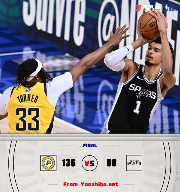 24直播网讯 北京时间1月26日讯 NBA常规赛巴黎赛,马刺继续对阵步行者。马刺20胜22负排西部第12,步行者24胜20负东部第5。比赛开始,双方开场势均力敌,比分咬得很紧,步行者内外开花取得两位数优势,次节马刺不断冲击内线得手扳平比分,步行者三分3连击稳住局势,马刺突然哑火,半场战罢步行者65-50领先马刺。易边再战,马刺大举反击,文班亚马攻防两端立功带队反超,哈利伯顿挺身而出三分4连击帮助球队重获两位数优势,末节步行者攻防两端发力打出8-0的攻击波一举将分差拉开到20分以上,马刺大势已去无力回天,沃克击中西索科头部被吹一级恶犯,马穆凯拉什维利推飞布莱恩特被吹二级恶犯直接驱逐。最终,步行者136-98大胜马刺,完成复仇。