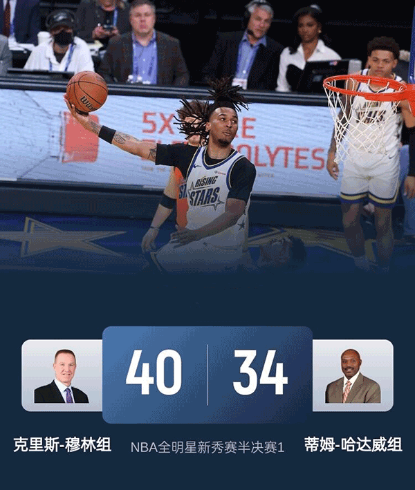 24直播网讯2月15日 NBA全明星新秀半决赛,克里斯-穆林组率先对阵蒂姆-哈达威组,比赛采用先拿到40分就获胜结束的赛制。比赛上来,克内克特就率先命中三分球,迪克则用上篮为哈达威组拿下首分,基昂特-乔治此后连拿八分帮助穆林组取得领先,克内克特的空切上篮将分差拉开到两位数,暂停回来后穆林组打得依旧出色,主场作战的TJD和克内克特相继送出暴扣,好在是哈达威组此后一波7-0完成止血,虽然迪克成为两队最先上双的球员,但穆林组这边全面开花,没有给对手反超的机会,凭借着卡斯尔的绝杀球,穆林组淘汰哈达威组。