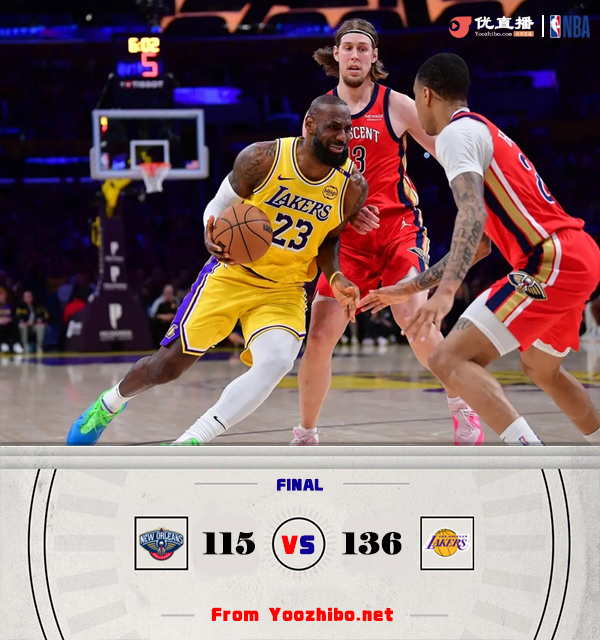 24直播网3月5日讯 NBA常规赛,湖人主场迎战鹈鹕,湖人目前6连胜后38胜21负高居西部次席,鹈鹕则是17胜44负排在西部第14位。本场比赛,里夫斯、八村塁和古德温继续缺阵。比赛开始,詹姆斯通过一记三分达成50000分神迹,随后东契奇连进3记三分带队13-2攻击波拉开比分,锡安连续攻击内线止血,首节湖人领先13分,次节霍金斯接连三分追分,锡安持续冲击内线单节砍13分,鹈鹕20-7攻击波一度追平比分,詹姆斯接连三分带队回应11-0攻击波止血,海斯连续内线吃饼暴扣半场砍19分,湖人依然领先10分。下半场,双方接连突破造杀伤展开拉锯战,东契奇三分继续火热,而且接连送助攻,湖人打出16-3攻击波直接拉开20分以上领先,末节锡安继续冲击内线挡不住,但詹姆斯里突外投强势回应,分差始终保持在20分左右,最终湖人136-115轻取鹈鹕,拿到7连胜。
