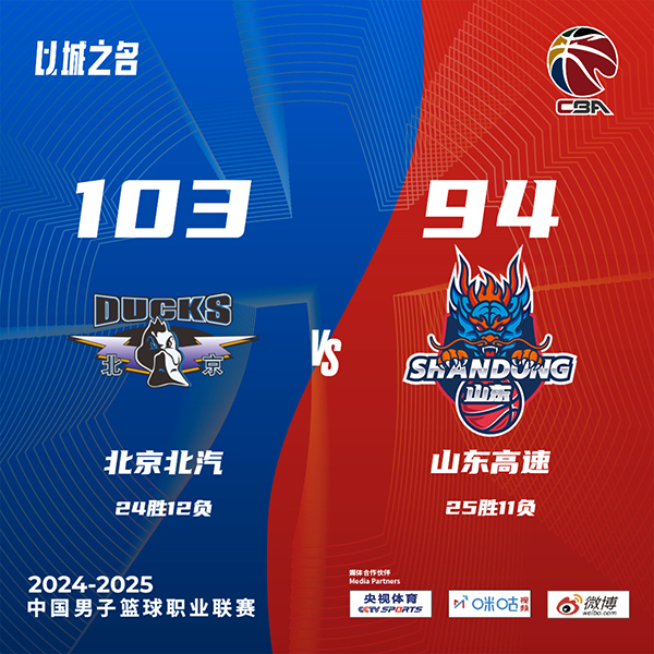 24直播网讯北京时间3月5日讯 CBA常规赛第三阶段战火重燃,北京主场迎战山东,北京目前23胜12负位列联赛第5,山东25胜10负排在第3。首节开打后双方稍显慢热,周琦连投带罚不断杀伤,山东双外援克里斯和盖利联手回应,山东中段开始发力后来居上,首节结束时山东领先7分,次节回来,山东进攻出现停滞,曾凡博突然爆发单节贡献13分,率领北京一举反超,半场战罢,北京反超3分。易边再战后山东进攻依然没有起色,曾凡博予取予求率队拉开比分,三节结束后北京继续领先7分,末节上来,陶汉林跳投打进后山东一度反超,北京内外结合迅速回敬12-2攻击波,山东追分未果,最终北京103-94力克对手。