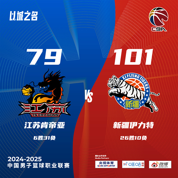 24直播网讯北京时间3月8日讯 CBA常规赛,江苏主场迎战新疆,江苏目前2连败后6胜30负排在第19位,新疆则是25胜10负排在第8位。比赛开始,崔晓龙接连三分打得很主动,但赵睿里突外投连砍9分带队回应11-0直接建立主动权,杰克逊接连止血,但新疆给出回应首节领先到16分,次节江苏进攻端停滞,新疆发力13-3直接拉开20分以上领先,随后江苏接连失误被新疆打成反击,半场新疆领先到31分。下半场,新疆进攻端有些松懈,江苏两位外援带队追分,但赵睿接连突破稳住局势,新疆重新稳住近30分领先,末节双方命中率都有下降,但新疆还是掌握住20分以上领先,随后双方练兵,最终新疆101-79大胜江苏。