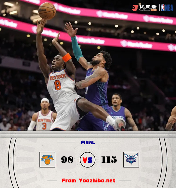 24直播网讯北京时间3月21日讯 NBA常规赛,尼克斯客场挑战黄蜂。尼克斯43胜25负高居东部第3,黄蜂17胜51负东部倒数第2。上半场,黄蜂率先发力打出9-2的开局,尼克斯内外开花反超比分, 黄蜂一波8-0稳住局势,次节双方围绕10分分差展开拉锯战,尼克斯不断冲击内线,黄蜂连投带罚强势回应,半场战罢尼克斯44-54落后黄蜂。下半场,黄蜂内外开花牢牢占据场上主动,尼克斯里突外投顽强追赶,末节两队继续围绕两位数的分差展开激烈争夺,黄蜂持续发力扩大优势,马威攻防两端建功,锡伯杜在比赛还剩2分钟时换下主力投子认负。最终,尼克斯98-115不敌黄蜂,客场落败。