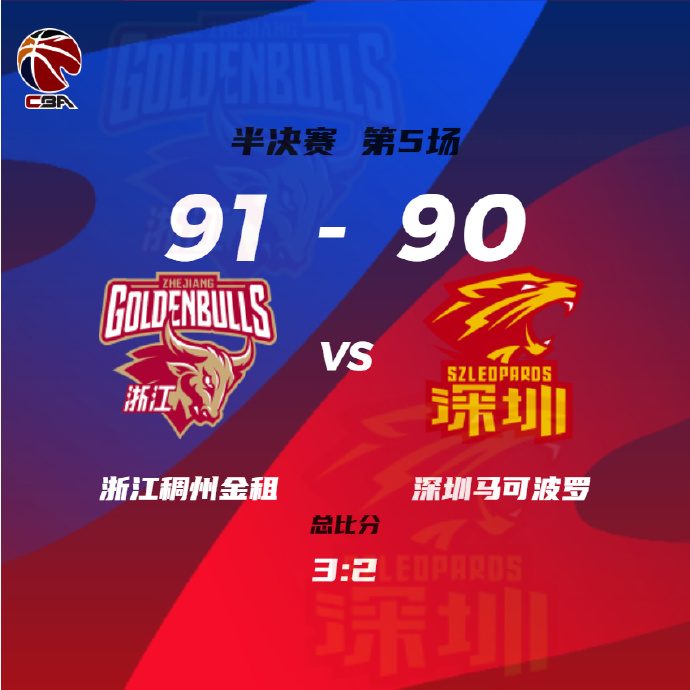 24直播网5月4日讯 CBA季后赛半决赛,浙江回到主场迎战深圳,两队上一场比赛上演精彩的绝杀与反绝杀,依靠程帅澎压哨三分的绝命一击,浙江涉险将大比分扳成2-2,将比赛拖到主场抢5。本场比赛,沈梓捷因伤缺战。双方上来状态不错,程帅澎延续上一场三分绝杀的火热状态,深圳则是靠萨林杰撑起进攻,随后全民皆兵的浙江抓住深圳接连失误打出12-0攻击波一举确立领先,但最后3分钟连续失误被深圳追分。次节双方增加防守强度,各种倒地频出,深圳一度反超比分,但很快浙江稳定情绪一波9-0稳住局势,白昊天压哨三分,深圳半场落后5分。下半场,浙江进攻端突然断电,还连续出现失误半节时间仅得2分,深圳连续反击加造杀伤打出15-0超级进攻波一举反超到近10分,吴前带领浙江开始追分,末节浙江一波15-4攻击波又反超回来,双方展开拉锯战,萨林杰关键三分再次反超1分,程帅澎空切上篮给出回应,贺希宁三分绝杀不中,最终浙江91-90险胜深圳,大比分3-2晋级总决赛。