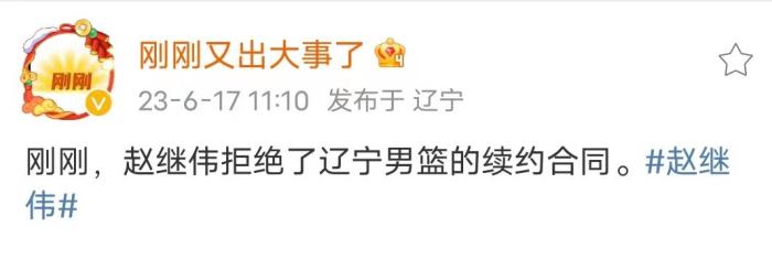 6月17日,知名媒体人“刚刚又出大事了”爆料:“刚刚,赵继伟拒绝了辽宁男篮的续约合同。”该媒体人的爆料源是哪里呢?其实是来自赵指导的直播。一夜之间,赵继伟拒绝辽篮续约也是上了热搜,甚至很多球迷担心赵继伟会上演去年郭艾伦的一幕。