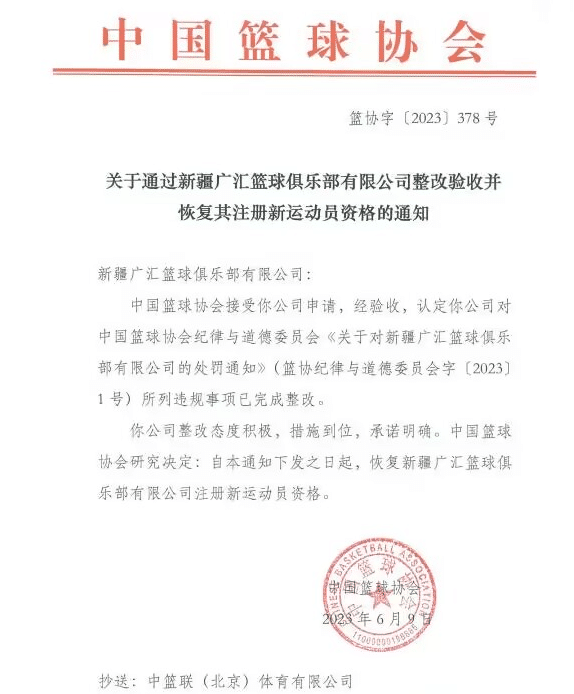 24直播网06月09日,中国篮协官方宣布恢复新疆男篮的注册新运动员资格,此前的处罚被撤销,原因是“所列违规事项已完成整改,整改态度积极,措施到位,承诺明确”,所以决定恢复新疆男篮注册新运动员的资格。