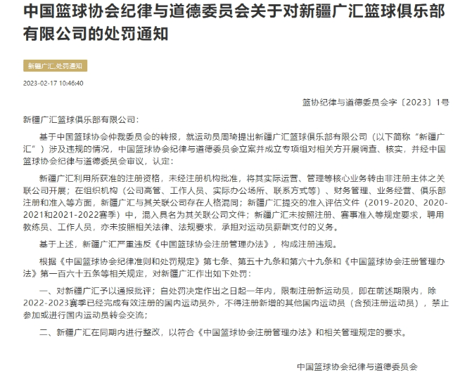 这件事情的起因是2023年的2月份,中国篮协基于周琦和新疆男篮合同争议的调查结果,公布了对于新疆男篮的处罚通知,其中就包括一年内限制注册新运动员,后期有媒体跟进称周琦恢复自由身。后期新疆男篮不服判决,直接宣布退出CBA联赛,导致他们一度缺席多轮CBA常规赛,其缺席的比赛场次按0-20告负积0分处理,也没有进入到季后赛的行列。