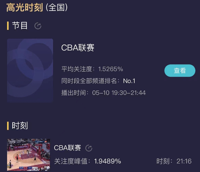 这场比赛的收视率有所下降,其实比赛中辽篮的优势很大,并未给浙江男篮太多的机会。体现在收视率层面,平均收视率1.5265%,巅峰时刻1.9489%,虽然依旧是同时间段的全国第一,但和总决赛G1、半决赛两场抢五巅峰收视率接近2.2%,还是有很大的差距。