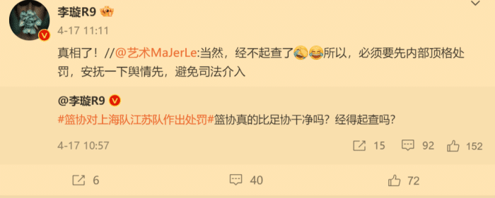随后,李璇又发布了动态表示:篮协真的比足协干净吗?经得起查吗?随后李璇也是自问自答的表示:中国男篮一样经不起查,当然经不起查,所以就必须内部顶格处理安抚一下,这才是事情的真相。
