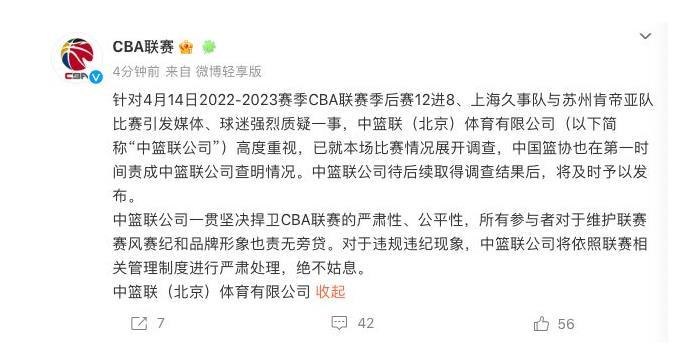 可随后江苏男篮的表现开始引发争议,江苏男篮1分钟4次失误,仅落后1分,李楠脸色铁青,坚决不叫暂停,总经理在一边偷笑。江苏男篮最终输了,可是赛后,媒体人和球迷都是怒骂,“假球”也是上了热搜第一名,在这样的情况下,CBA公司也是罕见的高效,在23:59分,CBA公司发布了通报表示:CBA将对这场比赛进行彻查,随后会向球迷通报事件的调查情况。