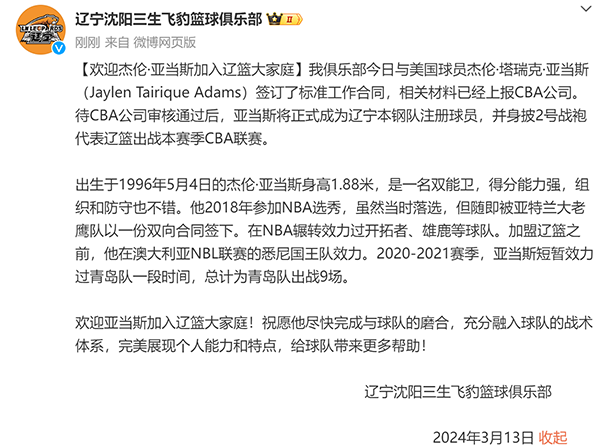 24直播网03月13日作为CBA的卫冕冠军,也是最近两个赛季的总冠军得主,辽篮本赛季的目标是冲击三连冠,外援的配置层面,此前辽篮都是双外援,如今第三外援驰援,为辽篮冲击冠军保驾护航,他就是曾经征战过NBA的杰伦-亚当斯。