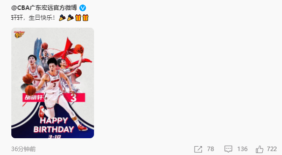 广东男篮在社交媒体上送上祝福,称:“轩轩,生日快乐!”