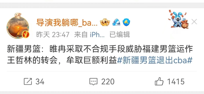那两条大鱼呢?第一只大鱼是随后被著名篮球媒体人“导演我躺那”爆料的经纪人睢冉。根据新疆男篮和“导演我躺那”的爆料,在此前王哲林转会上海男篮的交易中,睢冉对福建男篮使用了不合规定的办法进行威逼推动交易,牟取巨额盈利。