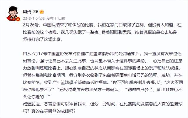 而在经历数周的沉默之后,周琦方面也在凌晨5点左右发布声明。在声明中,周琦开篇就表示新疆男篮发短信威胁他不会离队,随后例举了新疆男篮多次欺骗他、篮协和NBA的情况。周琦在最后表示,广汇篮球俱乐部是一个欺压球员、违规操作、欺上瞒下,视规则、契约、诚信于无物的私企俱乐部。