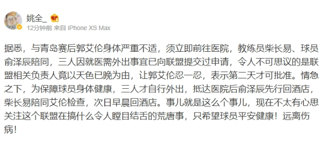 根据记者的后续报道,我们得知了这件事情原来会在CBA常规赛第三轮,辽篮击败青岛的赛后郭艾伦身体严重不适,须立即前往医院,被处罚的助教柴长易和球员俞泽辰是陪同外出的。但向联盟提交过申请相关负责人竟以天色已晚为由,让郭艾伦忍一忍,表示第二天才可批准。很显然郭艾伦是无法忍受才提出要求的,后期三人才自行外出,抵达医院后俞泽辰先行回酒店,柴长易陪同艾伦检查,次日早晨回酒店。