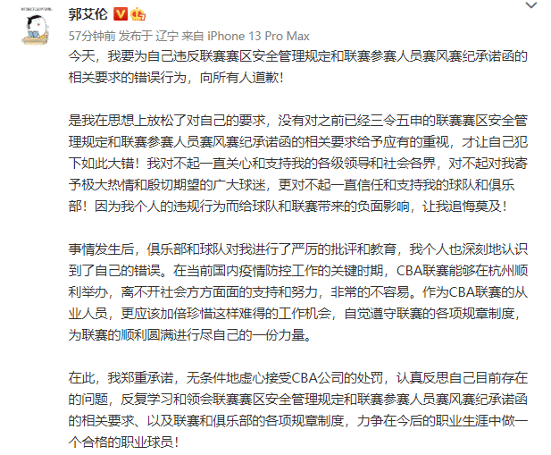 郭艾伦作为当事人之一,也进行道歉,他发布长文进行道歉,称对不起领导、球迷、俱乐部等等,无条件地虚心接受处罚,认真反思自己的问题。不过从CBA官方、辽篮、杨鸣和郭艾伦的道歉中,都没有提到郭艾伦等人违规的具体事情是什么?只是说了“违反赛区安全管理规定”没有具体是哪里违规了?为何违规了?