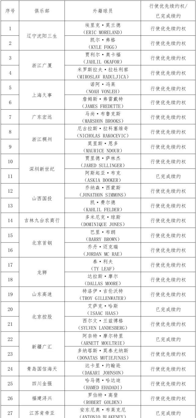 24直播网07月19日讯 ,CBA联盟官方公布了新赛季CBA各支球队行使外援续约权的情况,某种程度来说,球队是否对于外援使用优先续约权也被视为球队是否会留下外援的关键,毕竟一旦放弃优先续约权,外援将进入自由市场,应该没多少球队闲到给自己找对手抬价送外援大合同。