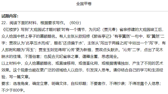 24直播网06月07日讯,高考作文出炉,这其中有我们非常熟悉的题材,比如“全国乙卷”的北京双奥之城,2008年北京奥运会和2022年北京冬奥会的题材,当然也有令人感到头疼的题材,目前在网络上最火的就是“全国甲卷”的红楼梦题材,指的是大观园竣工众人给园中桥上亭子的匾额题名的事情,根据这个材料,写一篇不少于800字的作文,几乎公认的今年高考作文最难的一个题材。