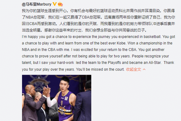 “我为你的篮球生涯感到开心。你有机会与最好的篮球运动员科比并肩作战并耳濡目染。你赢得了NBA总冠军,我们在一起又赢得了CBA总冠军。远离赛场两年后你重新证明了自己,我为你回归CBA而感到激动。人们看到的是你的天赋,而我看到的是你的努力带领球队冲进季后赛并当选全明星。感谢你这些年来的付出,我们会想念那些与你共同奋战的日子。”