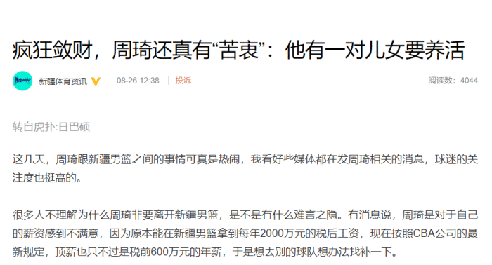 报道新疆男篮资讯的一个博主,在社交媒体上转发了一篇关于周琦的黑料。标题就是《疯狂敛财,周琦还真有“苦衷”:他有一对儿女要养活》。文章中写道,周琦因为薪水从税后2000万变成税前600万,心里有很大落差。而他本人还有一对子女要养活,这是周琦没有公开宣布的。