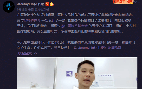 林书豪社交媒体上录制了一段视频,致敬医护人员,同时配文: