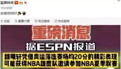 但随之而来的有些不怎么靠谱新闻缠上身,比如某音现在流传雄鹿正计划邀请胡明轩参加NBA夏季联赛。