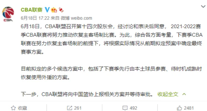如果CBA新政正式出炉的话,根据报道显示2021年肯定不会有外援在各队打球了,最早也得是明年2月份,这对于各支球队都是一个不小的考验,当然也期待新政细节的完善,争取恢复主客场的同时保障到各队的利益。