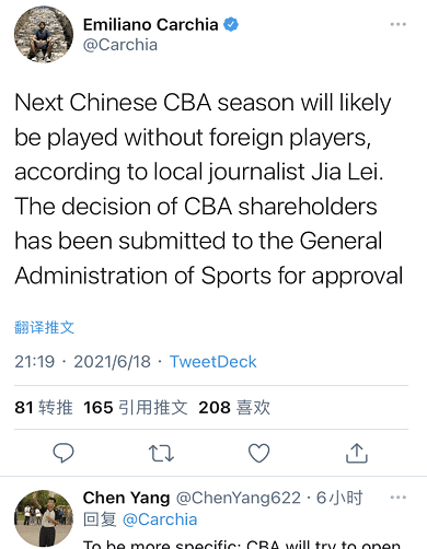外媒记者Emiliano Carchia通过社交媒体对于CBA新政进行了报道,也瞬间引发了外国球迷们的热议,通过球迷们的反馈,可以看出有不少人是调侃,也有人认真的问一些在CBA效力的外援将会何去何从。